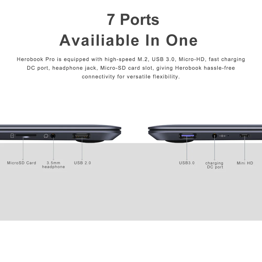 Herobook Pro est équipé de M.2 haute vitesse, USB 3.0, micro-hd, charge rapide