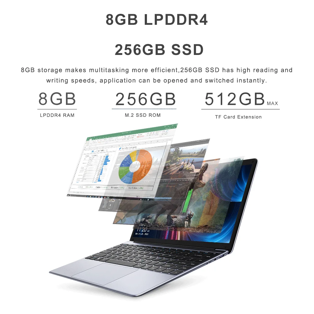Windows 10 OS pré-installé, navigateur Edge ainsi que Cortana Améliorera votre efficacité de travail, idéal pour Divertissement et productivité. 8 go LPDDR4 256 go SSD