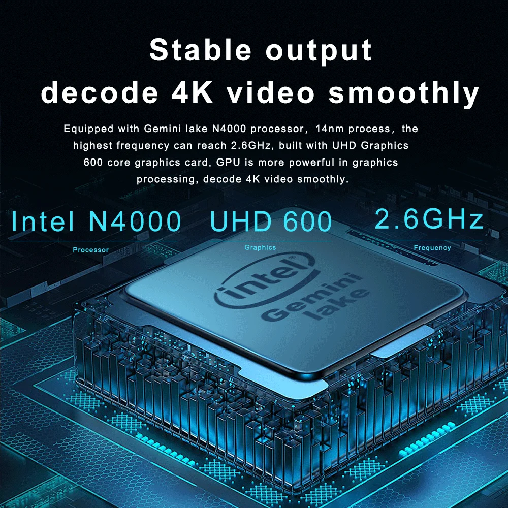 Équipé du processeur Gemini lake N4000, processus de 14nm, la plus haute fréquence peut atteindre