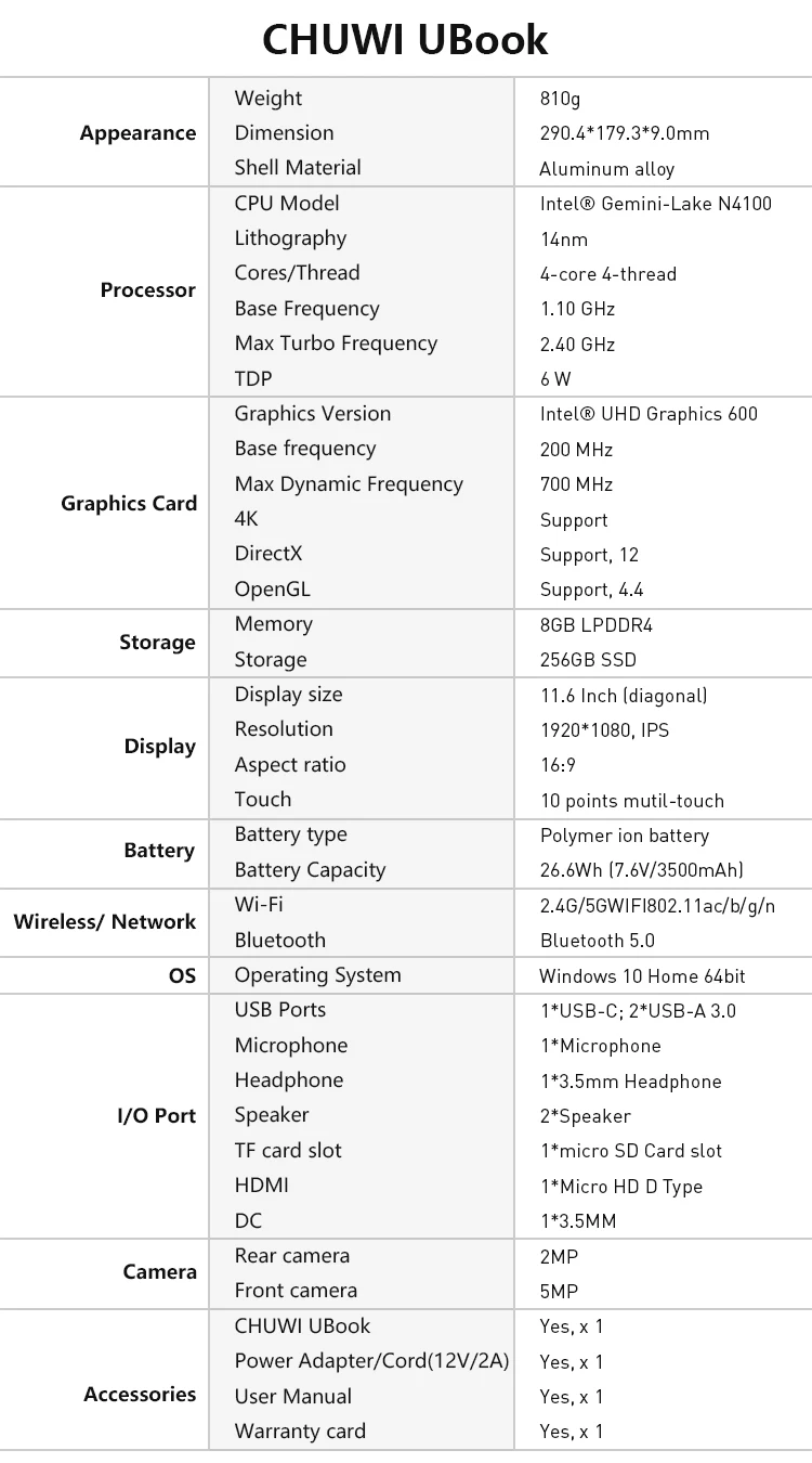 Best Price Comparison With CHUWI UBook 11.6 pouces IPS écran tablette PC Intel N4100 Quad Core LPDDR4 8 go 256 go SSD stockage Windows 10 OS tablette
