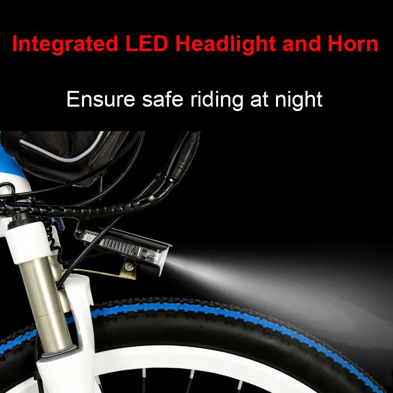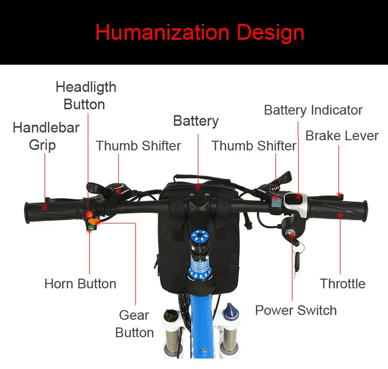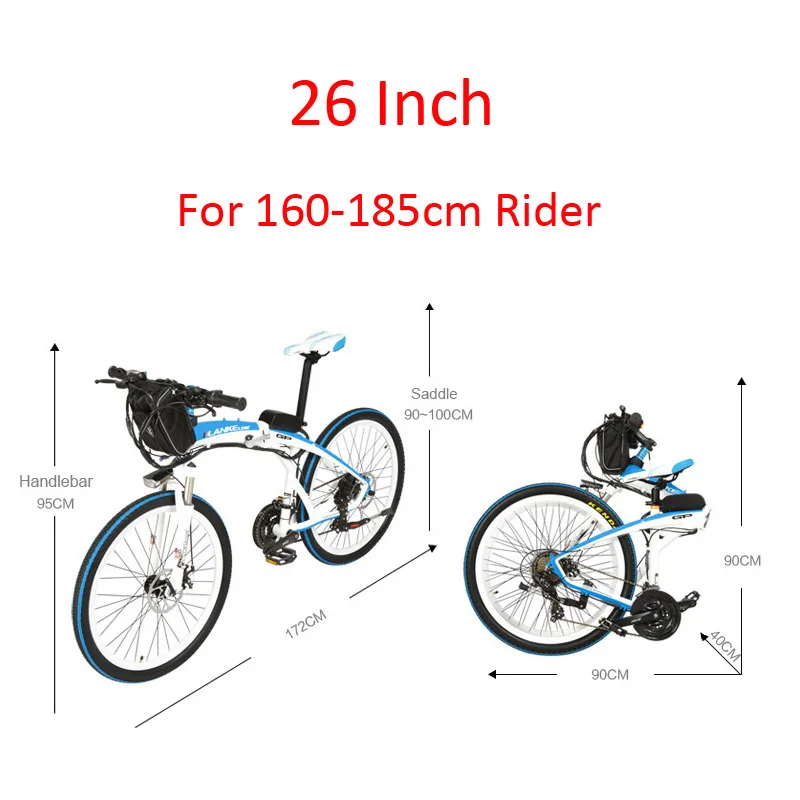 ParamètresCadre:Alliage d'aluminium 6061 et pliage Jante:Alliage d'aluminium 30H Dérailleur à pouce:TX30-7 de marque supérieure Dérailleur arrière:Meilleure marque TY300 Moteur:48V/400W Modes:Mode 1: Mode entièrement électrique;Mode 2: Mode d'assistance à la pédale;Mode 3: Mode manuel. Vitesse maximale: 30km/h Batterie:Batterie au Lithium, 2.6KG Chargeur:Spécifique pour batterie au Lithium et surprotégée Système de freinage:Frein à disque en alliage d'aluminium/frein de mise hors tension en aluminium Pneu:26 pouces * 1.95 et caoutchouc de haute qualité de marque supérieure Hauteur appropriée:Convient pour 160cm ~ 185cm Temps de charge:4 à 7 heures Fourche:Fourche à Suspension verrouillable en alliage d'aluminium Endurance:48V/12A (Mode 1: 25 ~ 35km; Mode 2: 50 ~ 60km) 48V/18A (Mode 1: 40 ~ 50km; Mode 2: 60 ~ 90km) Cadeaux:Un ensemble d'outils; Garde-boue; Verrouillage; Pompe.