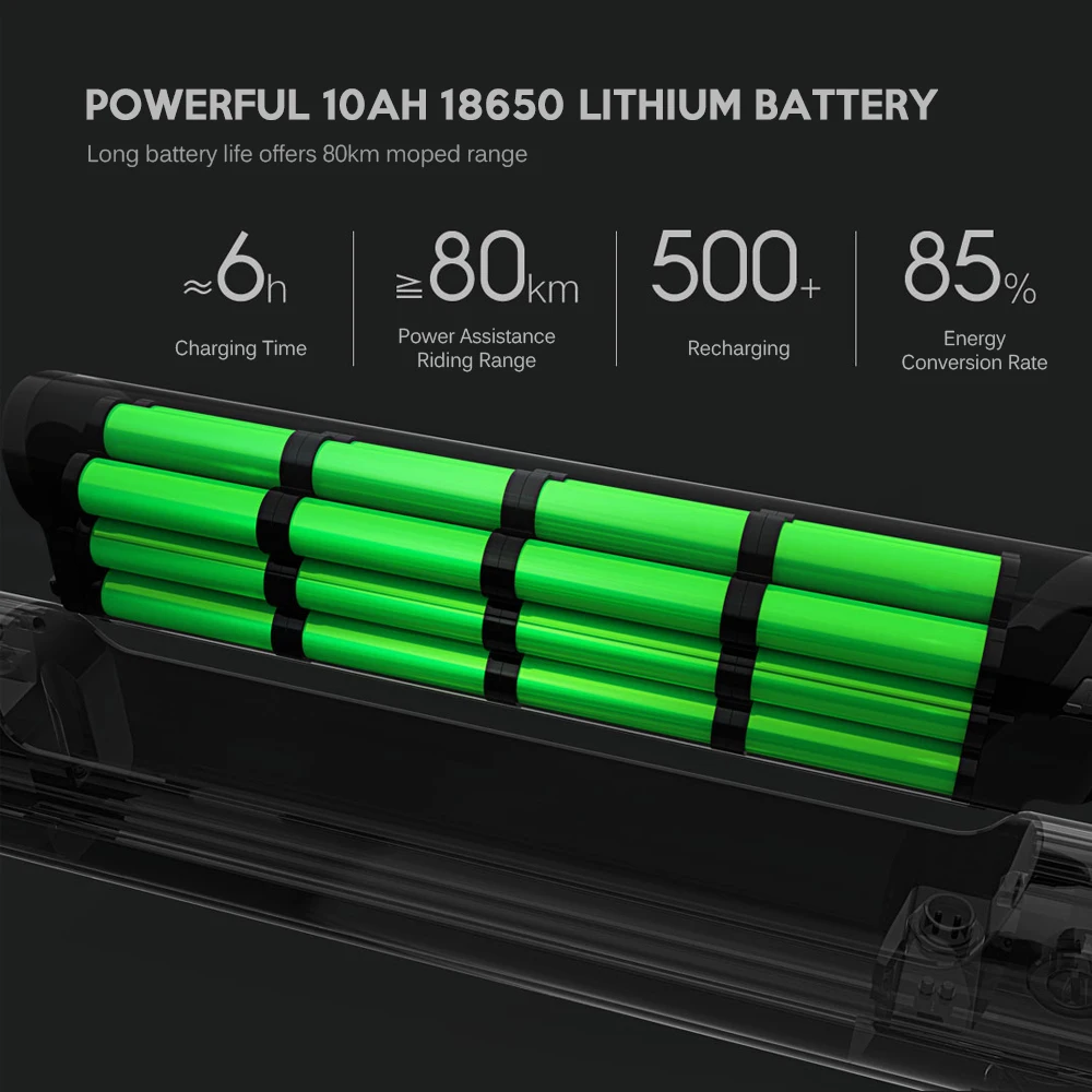 La batterie au lithium 10AH permet une autonomie de 50km en mode électrique pur, une autonomie de 80km en mode cyclomoteur.