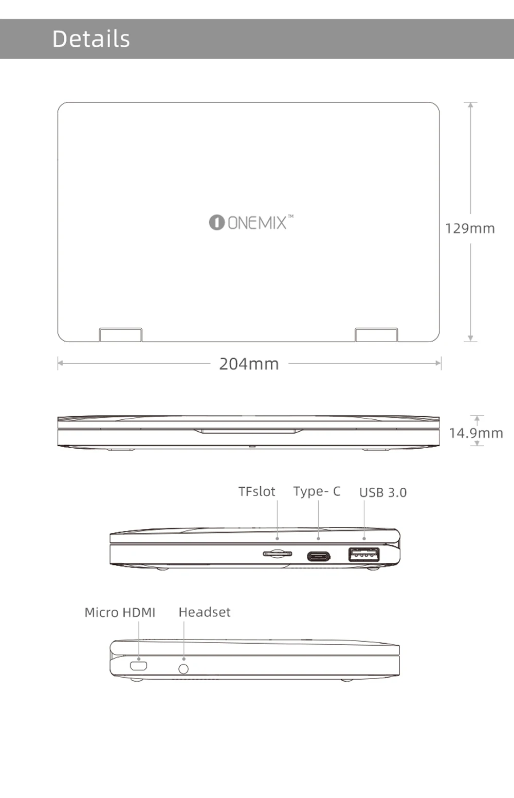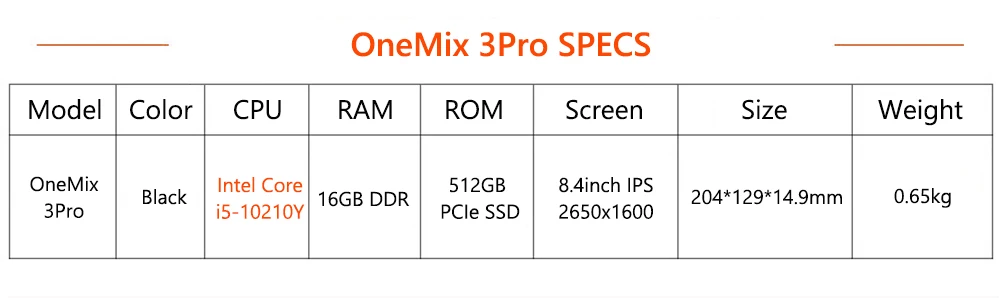 Attrapez vos 10GénérationProcesseur Soyez puissant et performant Onemix est conçu pour les voyageurs d'affaires. Petit et portable, mettez-le dans votre poche, ramassez-le et partez. L'énergie puissante, les performances puissantes des bureaux d'affaires et la température d'élite unique du processeur intel 10th génération core vous aident à vous débarrasser des chaînes de l'ordinateur traditionnel et à vous démarquer. Aussi petit que le téléphone portable Intel 10th génération core i5 OneMix pourrait facilement gérer le voyage d'affaires temporaire. Le poids est d'environ 0.65kg. Qui est mis doucement dans la poche du manteau. Lorsque vous avez besoin de travailler. Vous pouvez soulever d'une seule main doucement, ce qui est léger et portable, afin que vous puissiez profiter de votre travail et de votre vie à tout moment. Performances extraordinaires Construire dans Intel 10th génération core i5 L'onemix 3 Pro est équipé du processeur Intel 10th génération core i5-10210y. Basé sur l'architecture comet Lake de nouvelle génération, il dispose d'un processus de 14nm + +, avec une fréquence CPU de 4GHz, quatre cœurs et huit fils. Il a une forte résistance et apporte une expérience de fonctionnement plus stable et fluide. Le polyvalent 2in1 Il peut devenir une tablette Conception de charnière intelligente à 360 °, mode d'ordinateur portable pour le divertissement de bureau, mode de tablette pour la création de lecture, combinaison ingénieuse de la fonction d'ordinateur portable et de la fonction de tablette, peu importe dans l'avion, train à grande vitesse de voiture, ou le bureau peut être facilement appliqué. Micro Pcie SSD Ce n'est pas seulement différent, c'est rapide OneMix3 Pro construit en 16 go de RAM + 512 go PCIe SSD, le disque dur intégré intégré PCIe micro haute 512 go a non seulement de meilleures performances que le disque solide traditionnel, mais a également plus de stabilité et des coûts plus élevés. La performance de lecture-écriture est plusieurs fois supérieure à celle du SSD SATA. Vous n'avez pas besoin de perdre beaucoup de temps à attendre que le système démarre ou que l'application se charge plus, ce qui fait la marque d'innovation du mini ordinateur portable. L'agréable 8.4 pouces Écran IPS 2K La résolution de l'écran 2560x1600, ce qui a dépassé l'ordinateur portable Full HD général, qui a non seulement un champ de vision plus large, mais a également une expérience de visualisation délicate, un partage d'écran plus élevé et plus de pixels d'affichage. Il est plus efficace et facile de traiter diverses scènes lors de la conception de travaux créatifs avec des exigences élevées. L'artisanat rend la main plus agréable La technologie de CNC Coque en alliage d'aluminium et fuselage CNC sont solides et durables. Le design d'apparence simple et tendance d'onemix 3Pro. Le fuselage est à environ 14mm de la partie mince. Il est portable et solide. Les matériaux de haute qualité apportent une sensation spéciale. Évolution du clavier Mnouse infrarouge intégré Une nouvelle génération de stylet original Le clavier ne peut pas être remplacé stylet Onemix3 Pro supporte le stylet de niveau de pression 4096, vous pouvez tourner onemix comme votre ordinateur portable électronique personnel. Vous pouvez facilement prendre des notes, signer des documents et remplir des formulaires. Vous avez un écran plus grand Projetez votre écran Un seul câble HDMI ou une station d'accueil type-c peut connecter l'ordinateur portable à l'écran. Connectez le grand écran, partagez l'écran du projet, connectez l'imprimante. Et rendre la démonstration de réunion sur site et le bureau non mobile plus facile et plus efficace. USB type-c Port USB type-c, c'est un mode de liaison haute performance, qui vous rend plus confortable avec plus de scénarios de travail. Intel 10 genetation CPU Endurance plus longue Processeur Intel 10th génération, nouveau processus, vitesse plus rapide, faible consommation d'énergie, l'endurance mesurée est nettement meilleure que le processeur core y de huitième génération, et le même niveau peut être augmenté d'environ 20%. Meilleur jeu de charge d'urgence pour les voyages d'affaires Prend en charge l'alimentation de 5V, 9V, 12V powerbank Onemix3 Pro a une batterie plus grande, et il peut également prendre en charge la charge d'alimentation mobile comme un téléphone portable. Il est recommandé d'utiliser le protocole PD pour charger rapidement l'alimentation mobile. Votre empreinte digitale est votre mot de passe Touchez pour déverrouiller Copie légale Windows OS Efficace, poortable et fiable