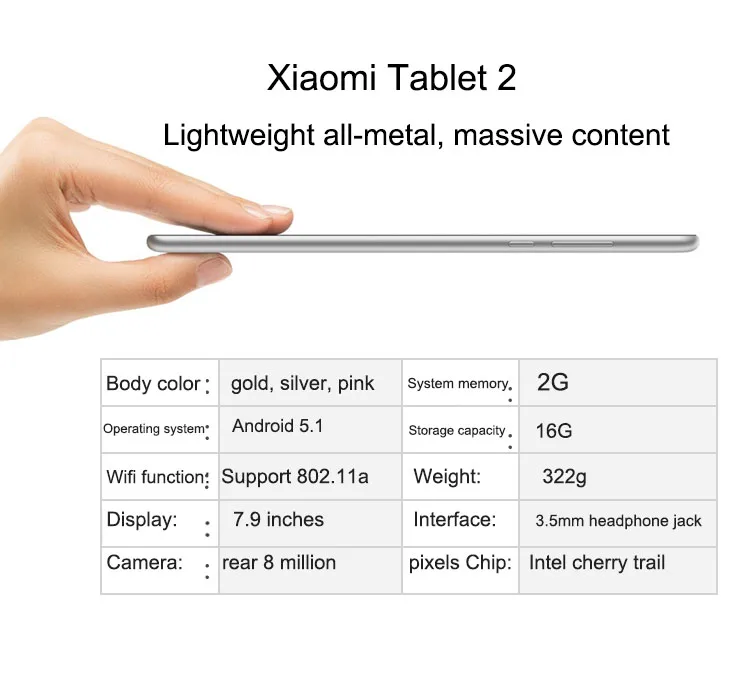 Couleur du corps: or, argent, roseMémoire système: 2GSystème d'exploitation: Android 5.1Capacité de stockage: 16GFonction Wifi: prise en charge 802.11aPoids: 322gAffichage: 7.9 poucesInterface: prise casque 3.5mmCaméra: arrière 8 millions de pixelsPuce: Intel cherry trail