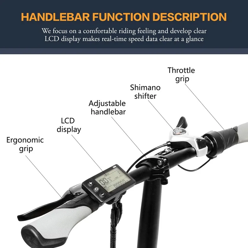 Autonomie en Mode électrique pur: environ 45km.Portée du Mode PAS: environ 90km.Levier de changement de vitesse Shimano 7 vitesses + dérailleur arrièreFrein: frein à disque mécanique avec fonction de coupure de courantAngle Maximum d'escalade: 35 °Multifonctionnel Intelligent D'affichage À CRISTAUX LIQUIDESLa batterie est cachée dans le tube du cadre.